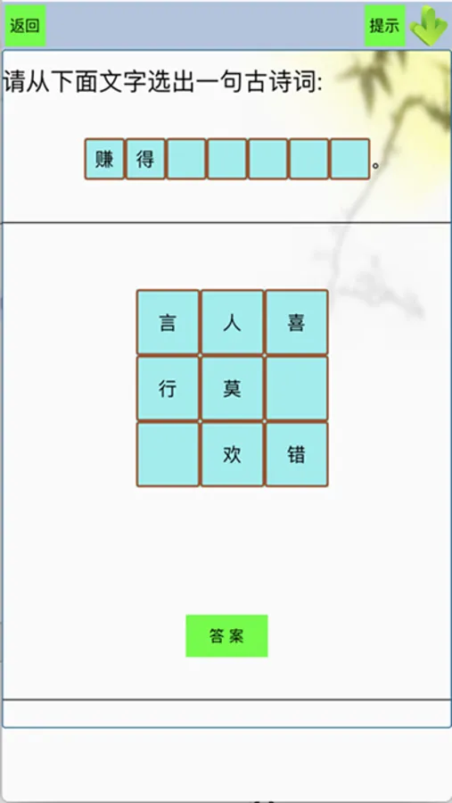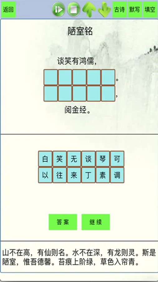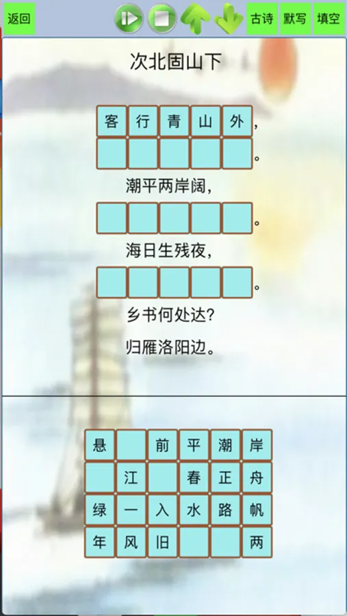 4.填空模式下用选字填空的方式帮助记忆古诗,每次自动生成不同诗句的填空内容。