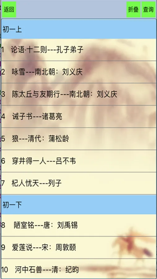初中古诗文软件旨在帮助初中生更加轻松的背诵古诗和文言文。软件收集了所有初中课内外必背的古诗和文言文。软件分为诗词和古文两部分。软件提供如下功能辅助学习古诗文: