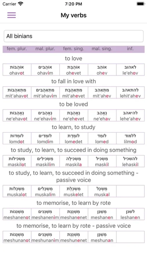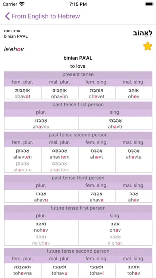 - More, than 3500 Hebrew verbs. For each verb there is a translation into English, verb root and various forms: infinitive, present, past and future tense forms, imperative mood and forms of all persons, both singular and plural, masculine and feminine.