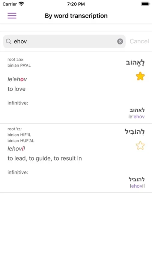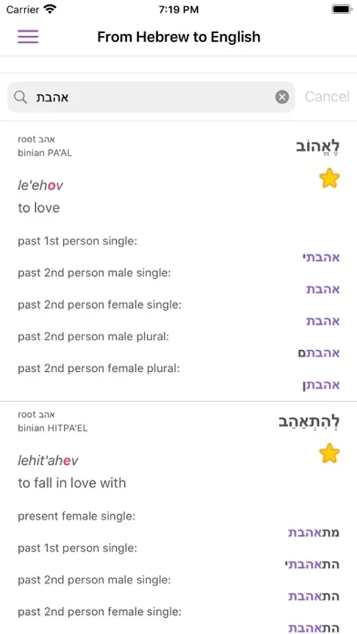 - When searching for a translation from English into Hebrew, you should always write English infinitive form, for example, "love" or "to love". When searching for a translation from Hebrew into English and when searching by transcription, you can use any Hebrew form of a word or any part of any form: all occurrences of the specified letter combinations will be found.