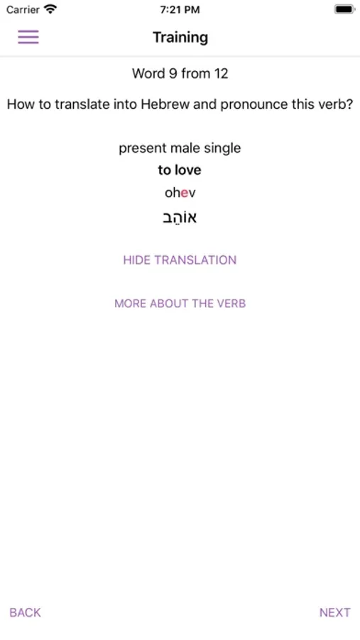 - Use simulator training mode: practice translating words from English into Hebrew, correct Hebrew pronunciations and translation from Hebrew into English.