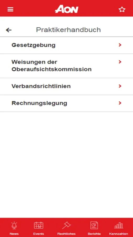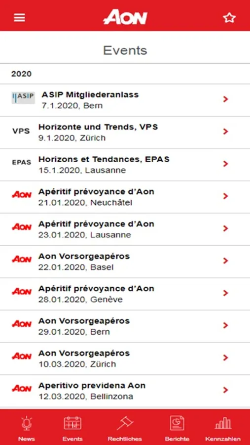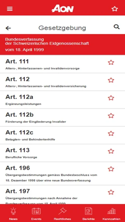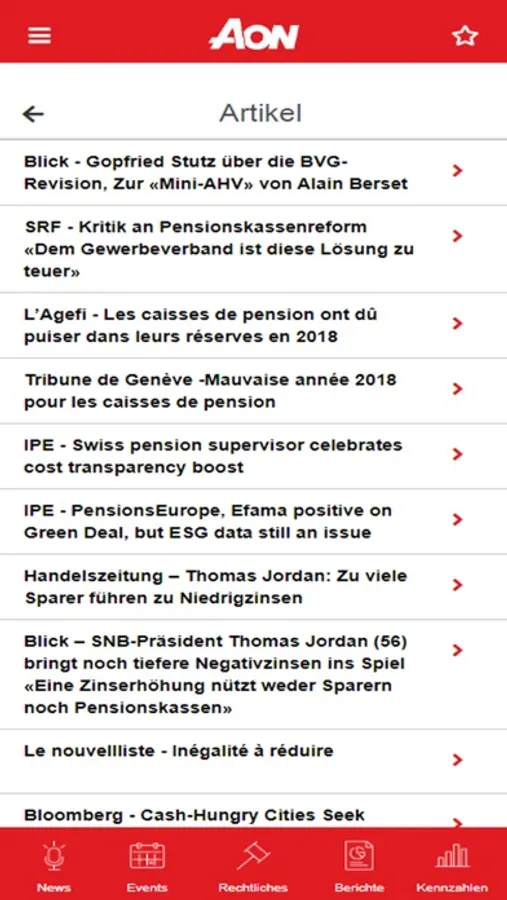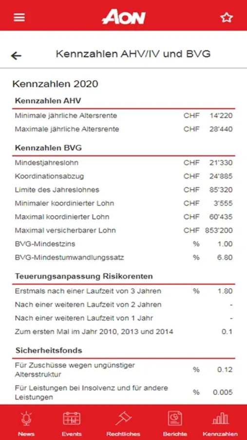 Die Aon BVG-App bietet ein breites Angebot wie News, Informationen zu aktuellen Themen und Hinweise zu neuen Studien. Als Nutzer erhalten Sie sowohl relevante Artikel aus den Medien als auch Wissenswertes aus der Branche und der Politik. Die App bietet ebenso hilfreiche Daten wie die massgebende und aktuelle Gesetzgebung, alle Kennzahlen der beruflichen Vorsorge, Weisungen der OAK, Verbandsrichtlinien und Rechnungslegung, ebenfalls sind BSV-Mitteilungen aufgelistet und relevante Gerichtsurteile verlinkt. Ein Kalender mit den wichtigsten Events der Branche rundet das Angebot ab.