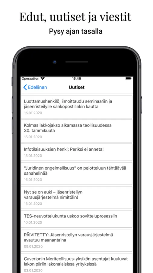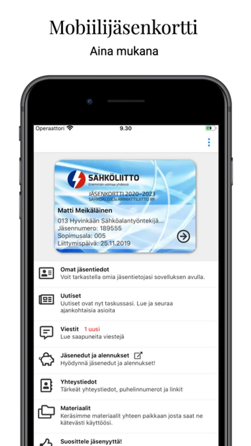 Sähköliiton mobiilisovellus on palvelu, josta löydät mm. jäsenedut, uutiset, vakuutustiedot ja tärkeitä yhteystietoja. Pääset näppärästi päivittämään myös omia tietojasi. Sovelluksesta löytyy Sähköliiton mobiilijäsenkortti.