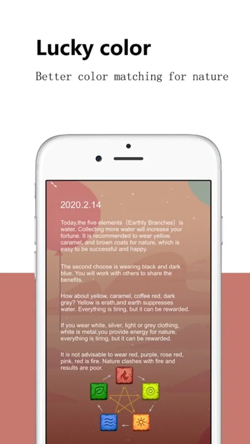 2.Five-Elements Calendar: Follow nature and get good luck - Follow the daily energy of the five elements (metal, wood, water, fire, earth) in accordance with natural laws - Get tips for a good mood based on your personal elemental traits - Choose lucky clothing colors based on the relationships of generation and conquest among the five elements.