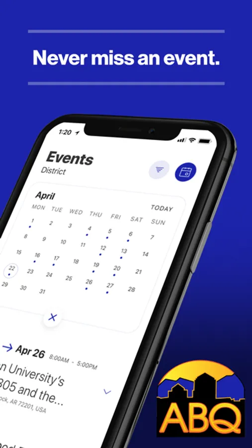The event section shows a list of events throughout the district. Users can add an event to your calendar to share the event with friends and family with one tap.