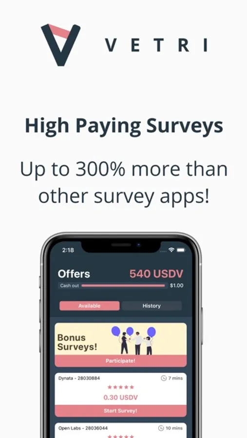 VETRI is a non-profit foundation, hence 90% of all value we receive from market researchers is given back to VETRI users, the remaining 10% is used to maintain/enhance the app and bring more money-making opportunities to you. Thus making us the app that pays the most out of any other survey app, up to 300% more!