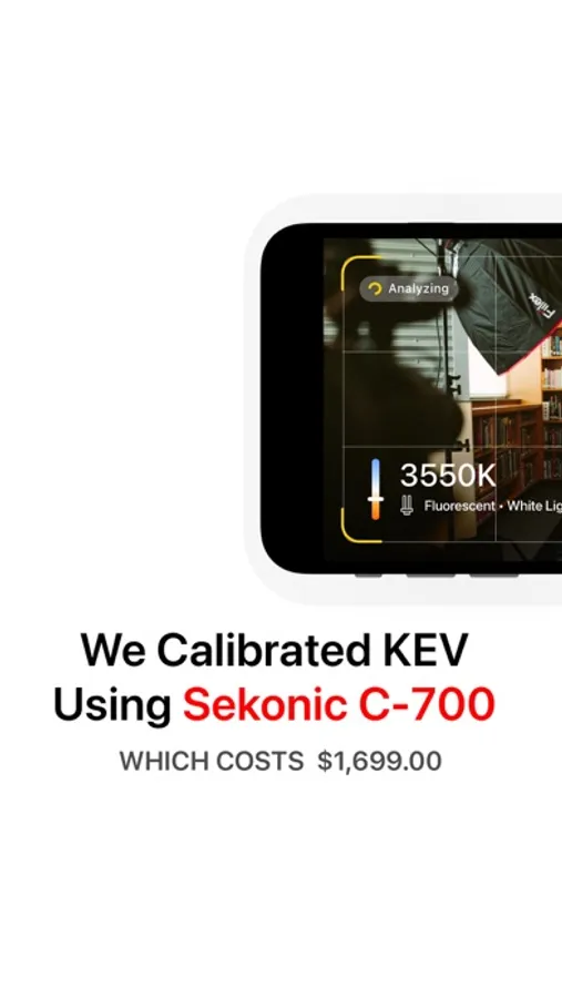 We calibrated KEV using Sekonic C-700R-U SpectroMaster Colour Meter, and we guarantee from fair to almost 100% accuracy. Just open the KEV app and point the camera on surface or scene.