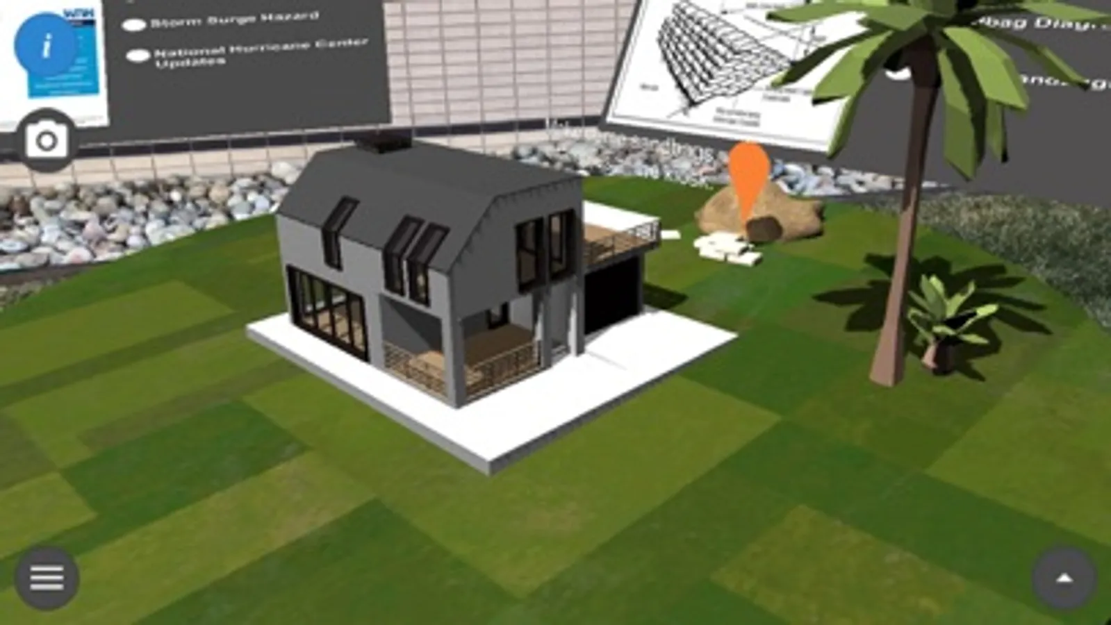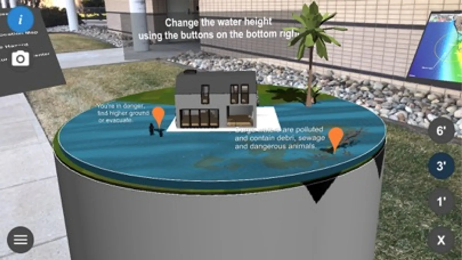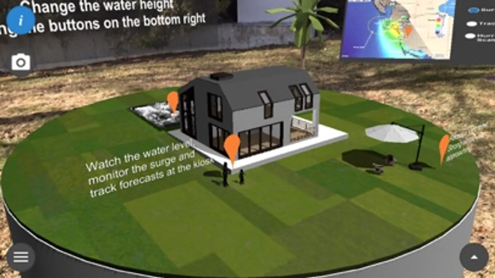 Augmented reality storm surge simulator showing the potential impacts of hurricane storm surge inundation. It offers helpful information about preparations prior to the arrival of a hurricane.
