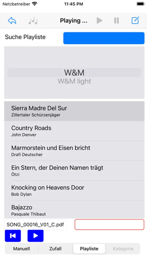 Die Lieder können manuell, zufällig oder nach vordefinierten Playlisten sequenziell dargestellt werden und bei mehrblättrigen Vorlagen weitergeblättert werden.