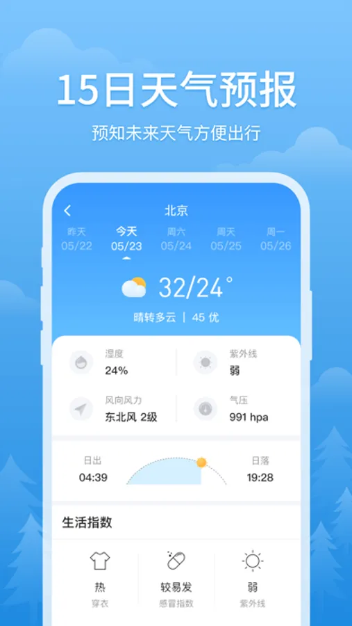 提供实时天气信息,24小时天气预报、未来15天天气预报等全面天气信息。提供穿衣、紫外线、舒适度等 生活指数。简单天气,为您开启美好生活!