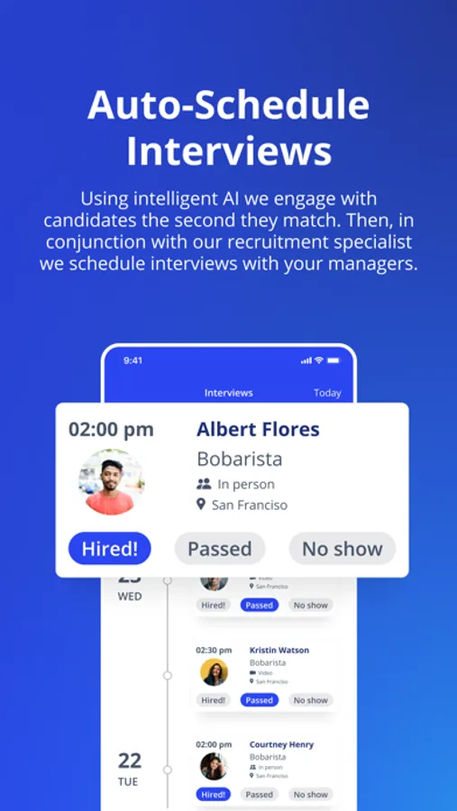 3. You’ll have access to vetted candidate profiles, videos, & schedules. Invite them for an in-person interview instantly.