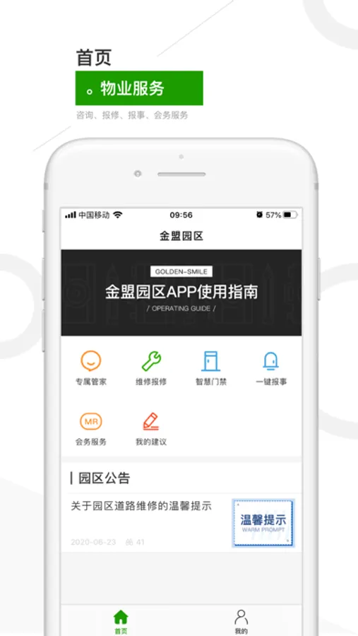 金盟园区是一款基于互联网思维打造,为园区入驻的企业及白领定制开发的智能物业服务平台,是以物业服务、智慧社区、生活服务为核心的创新型物业服务平台,它让您的工作和生活更加便捷、安全、舒适。您可以通过APP进行报修维修、与专属客服一对一沟通、会议室预订等。目前只对合作的园区内的入驻企业与白领开放注册认证。