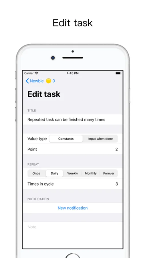This is an app for self-management. Win point by finish task. Use coins to self-reward.