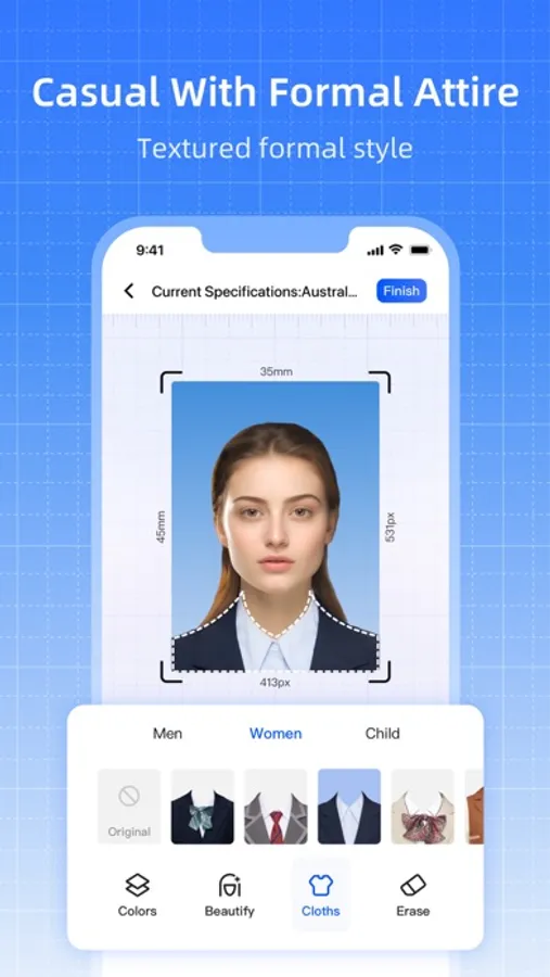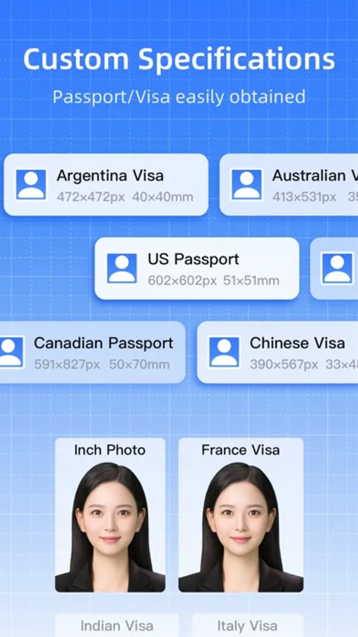 ◆Hundreds of ID photo specifications Not only supports customized ID photo sizes, but also provides more than 100 official ID photo specifications. For example: regular size photos such as one-inch and two-inch photos, various examination certificates for civil servants, doctors, teachers, accountants, driver's licenses, etc., social security, resume and other types of photo specifications.