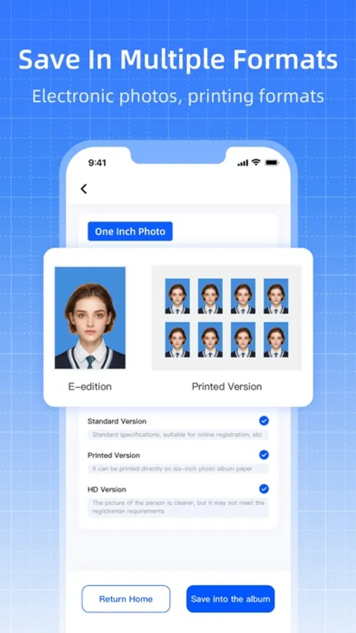 ◆Save in multiple formats. You can save the watermark-free version of the electronic ID photo in the photo album, and you can also directly save the photo in the printed version, which is convenient, fast, easy and professional.