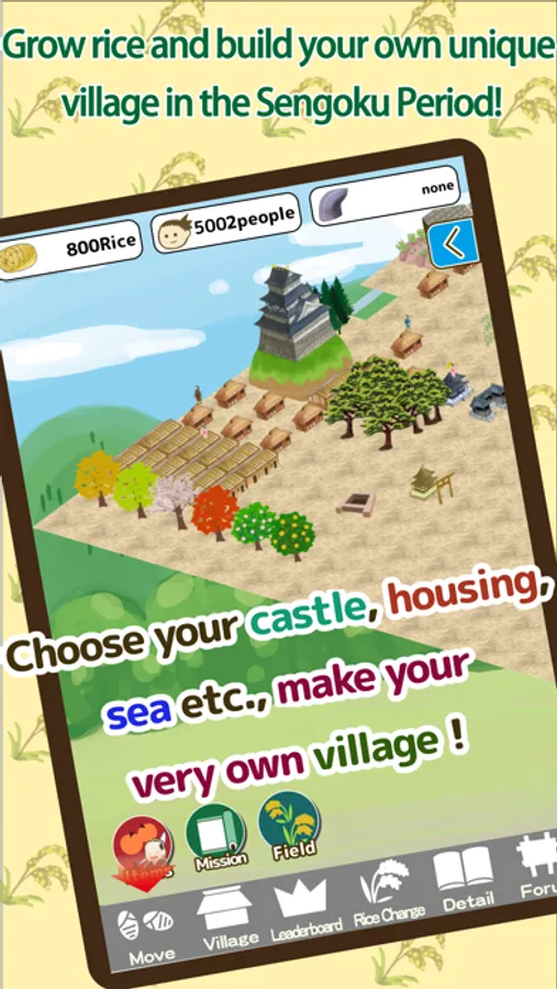 Select your favourite region in Japan, and as the leader of a village that bears your name, you will build and progress your village during the Warring-States Period. Grow rice in your rice fields and harvest them to collect Rice Points. The Rice Points can be used to build Castles, Housing and Rice Warehouses. It is your duty to gain more villagers and friends, and to expand the village.