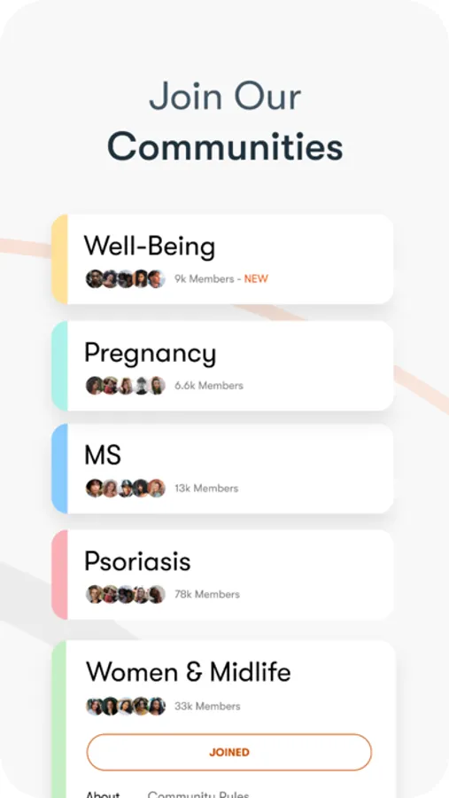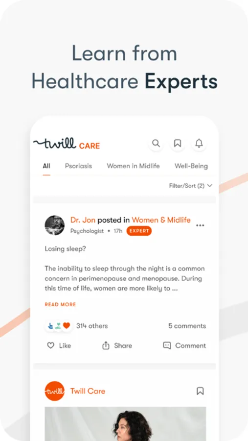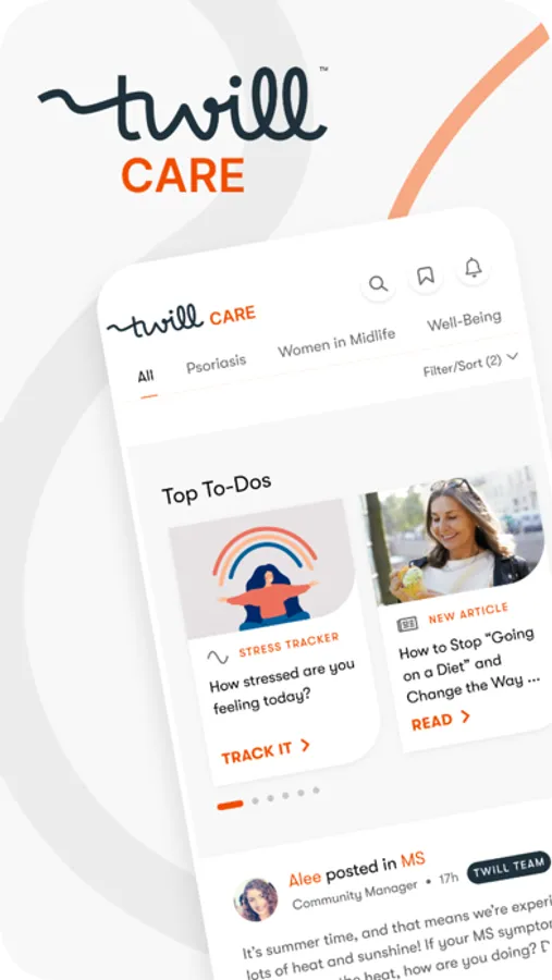 Twill Care (formerly Kopa) is a free app that supports five communities—MS, Pregnancy, Psoriasis, Well-Being, and Women & Midlife.