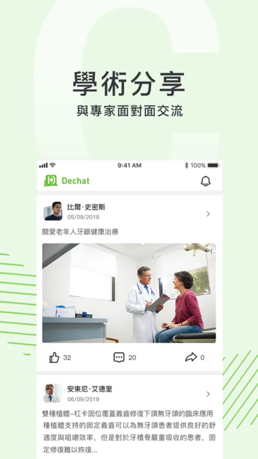 Dechat是一個可以接觸世界各地牙醫大師的平臺,可以在平臺上進行互動交流學習,並查看最新資訊。