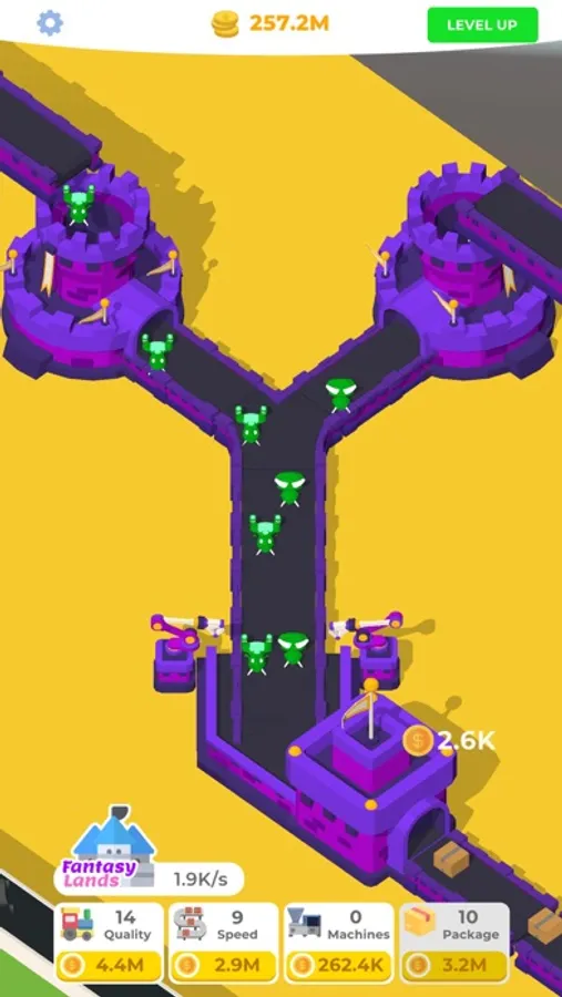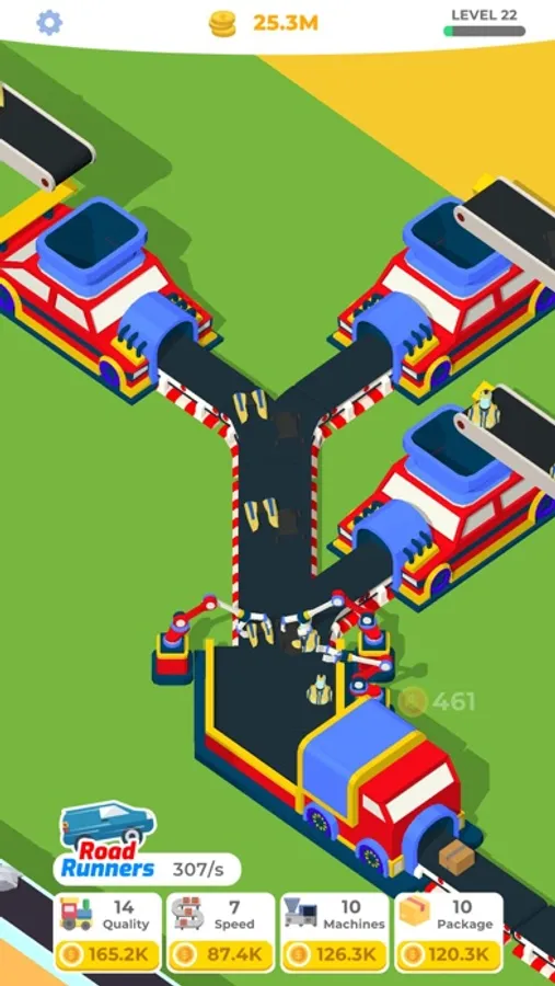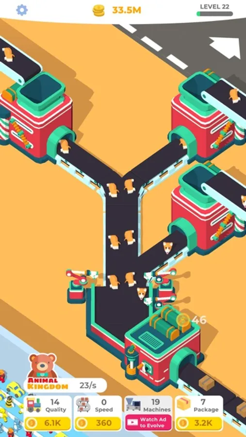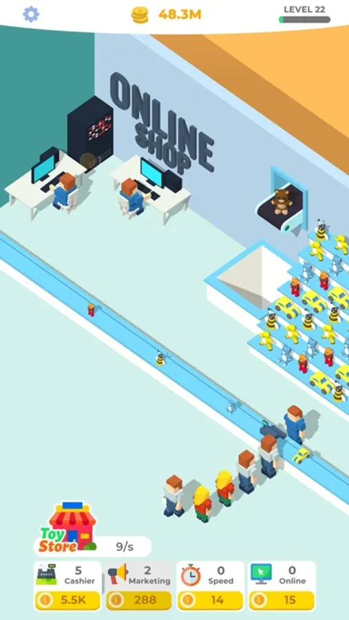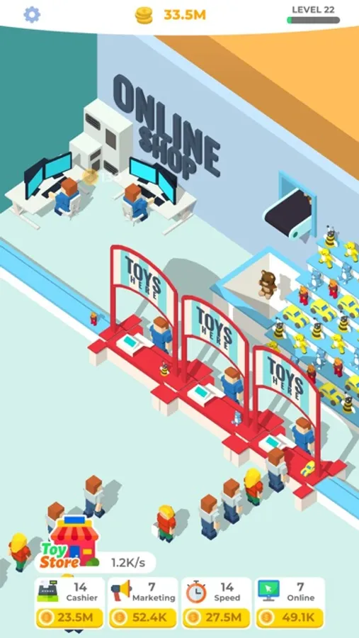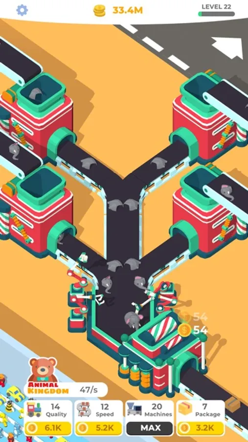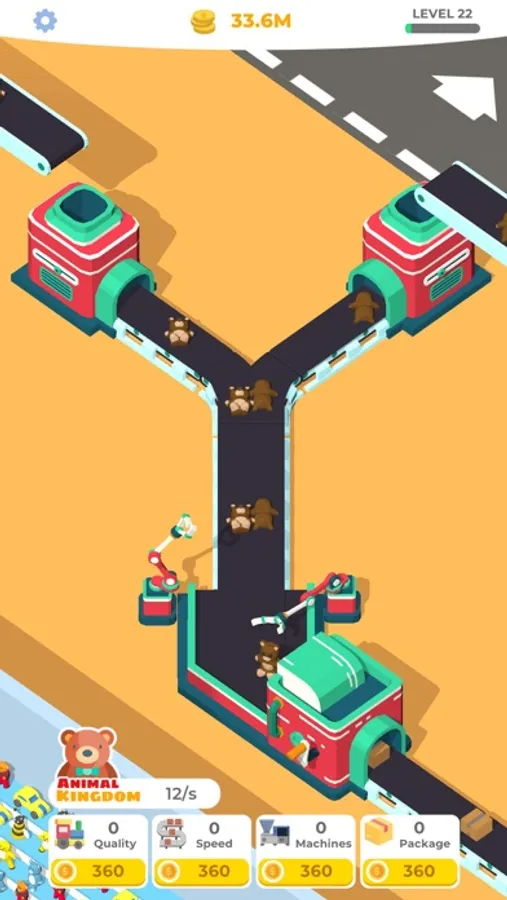 Buy and upgrade factories producing animal toys, toy cars, and fantasy toys.