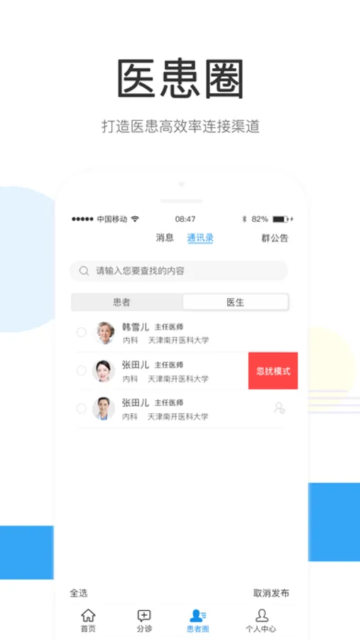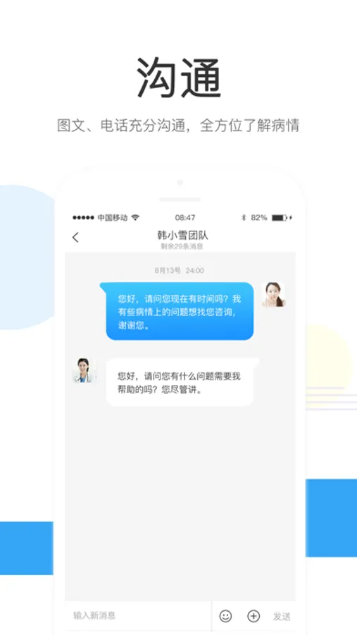 这里您可以随时随地使用手机对您看过的病人进行图文复诊,方便快捷。