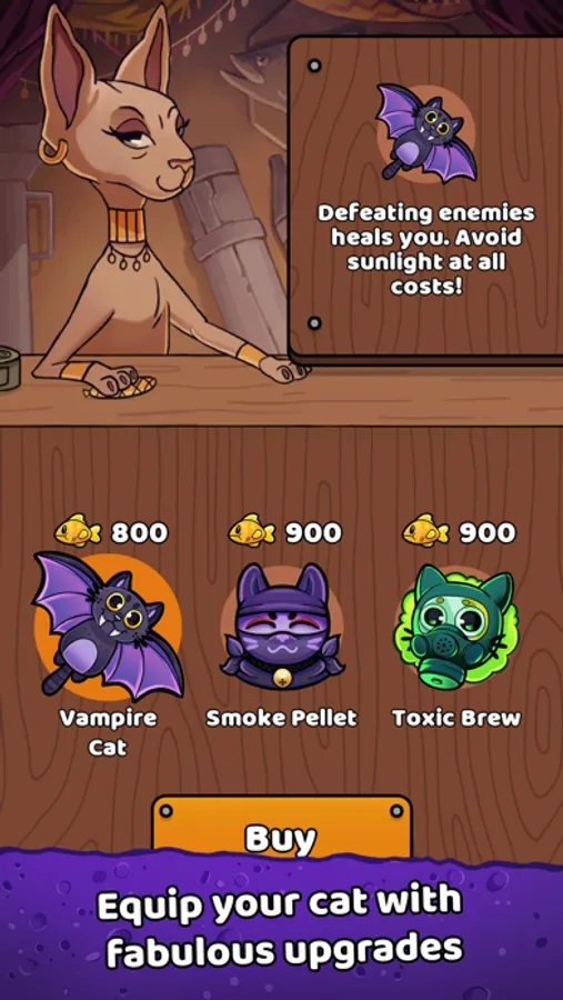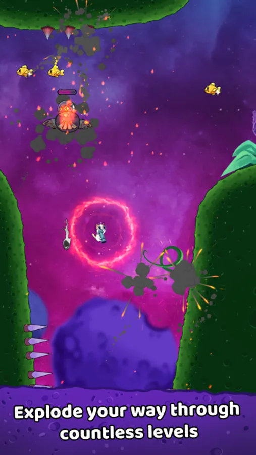 Hunt the monsters down, explore, find your way through obstacles and finish the stages to get worthy prizes! Exchange tasty Goldfish, Silver Cans and other tokens you collect for fabulous equipment and level your cat up to be even more furrious. Upgrade your bazooka, get new enhanced types of rockets and be pawesome! Boom!