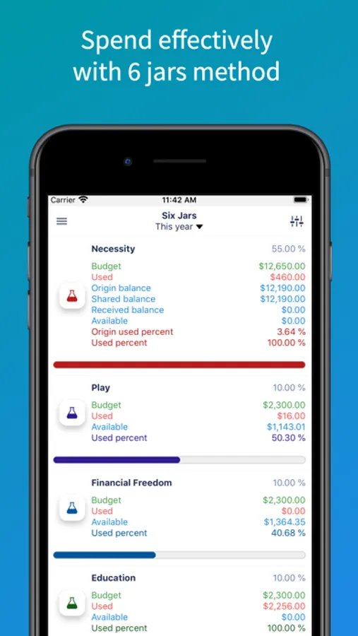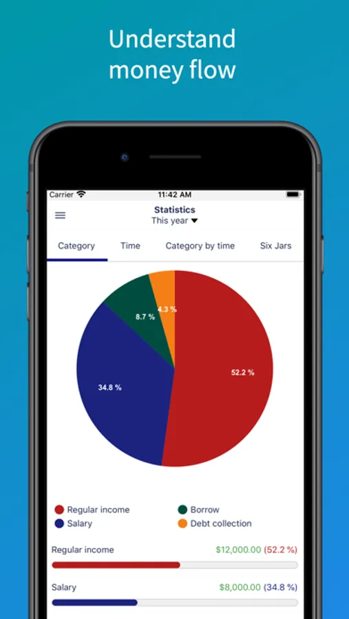 - Financial statistics: all statistics are visualized by the charts. It'll be easier to track money by categories or the time or 6 jars method.