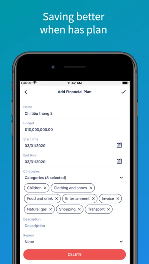 - Financial plan (Vip package): it will warn if it has a new expense record that makes over budget for a specific category in a duration.
