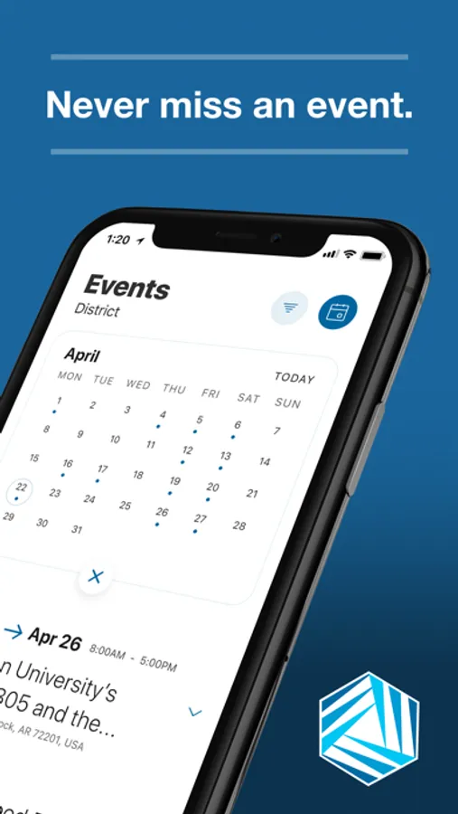 The event section shows a list of events throughout the district. Users can add an event to their calendar to share the event with friends and family with one tap.
