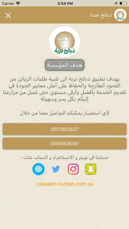 يهدف تطبيق ذبايح تربة إلى تلبية طلبات الزبائن من اللحوم الطازجة والحفاظ على أعلى معايير الجودة في تقديم الخدمة بأفضل وأرقى مستوى حتى تصل من مزارعنا إليكم بكل يسر وسهولة