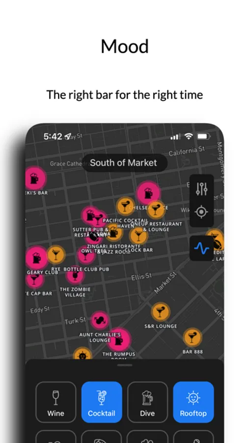 * Search by filter: find your favorite bars by filter, rooftop, cocktail, dance, whatever you like