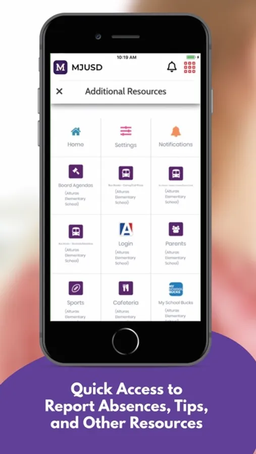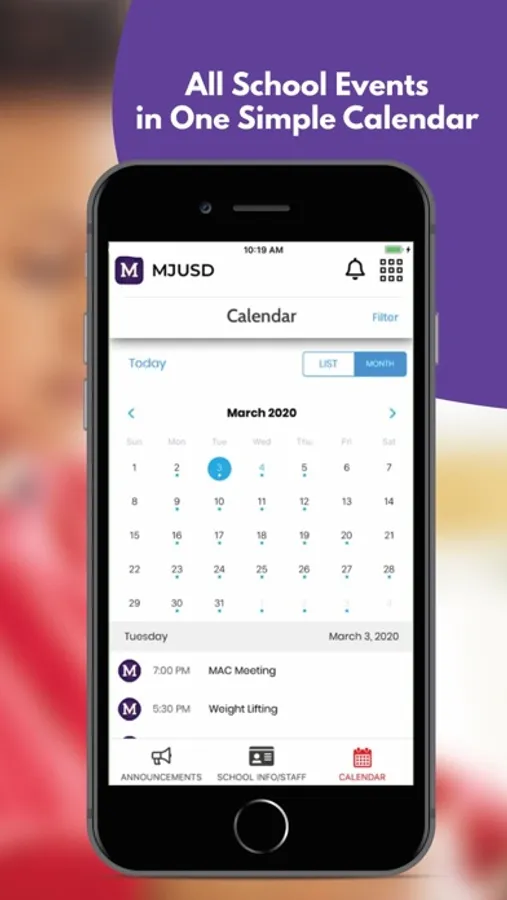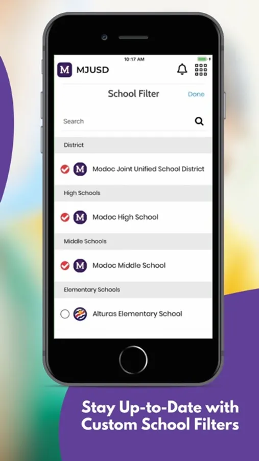 The app includes information for the district and all schools. Filter by the school your child attends to feature information for that school.