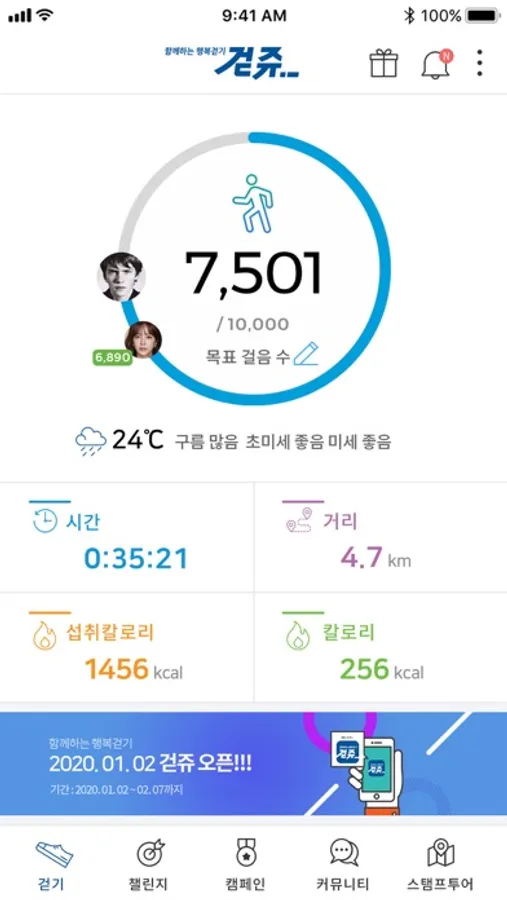 함께하는 행복걷기 캠페인에 참여해 보세요. 공동목표 걸음을 달성하면 추첨을 통하여 걷쥬 포인트를 모을수 있습니다.