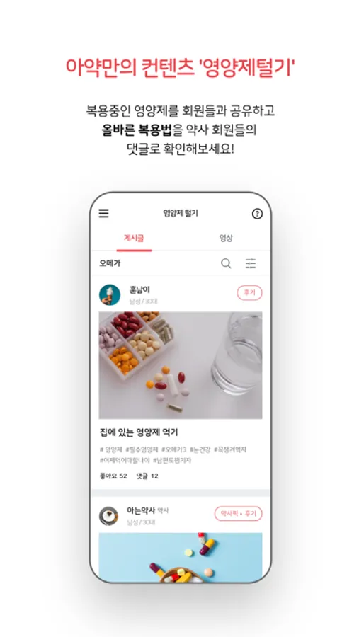 ‘영양제털기’란 자신이 현재 복용 예정 혹은 복용 완료한 영양제들을 공유•리뷰하는 SNS형 컨텐츠입니다. 솔직한 후기를 회원들과 공유하고 올바른 영양제의 복용법을 약사 회원들의 댓글로 확인해보세요! 약사 회원들의 영양제 리얼후기와 아약TV 채널의 영양제털기 영상도 보실 수 있습니다.