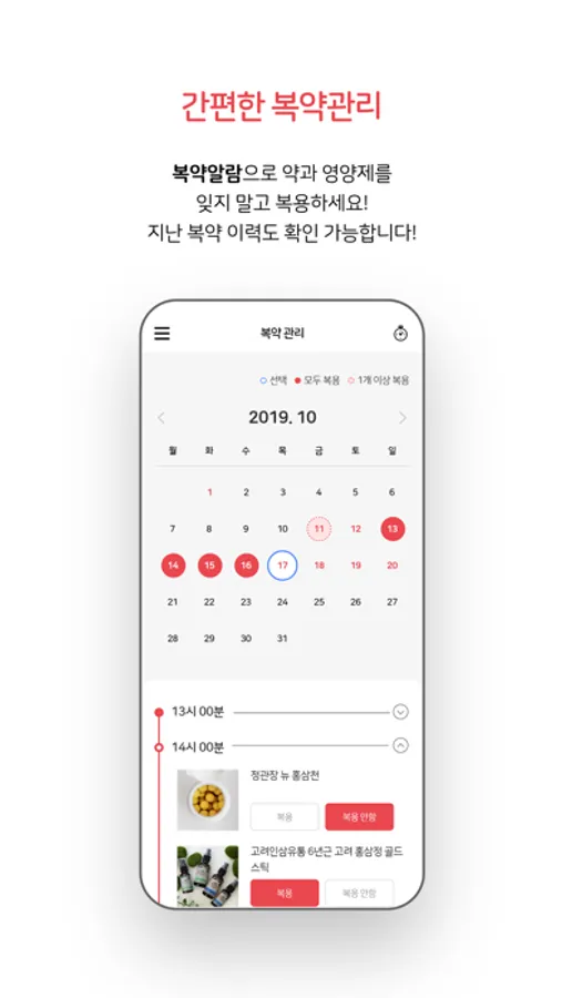 약/영양제를 잊지 않고 복용하실 수 있게 복약알림 기능이 탑재되어 있고, 복용 후 복약 체크를 통해 캘린더에서 지난 복약이력을 확인하실 수도 있습니다.