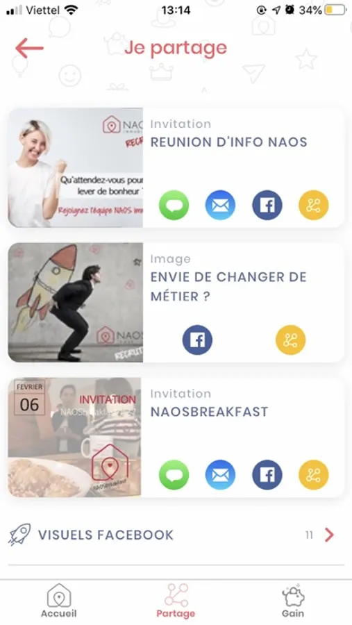Depuis l’application NAOSfamily tu peux envoyer en un clic des vidéos et des photos de NAOS par sms, et les inviter à des événements sur facebook.