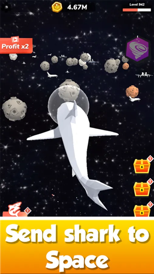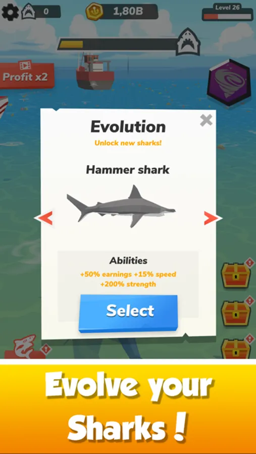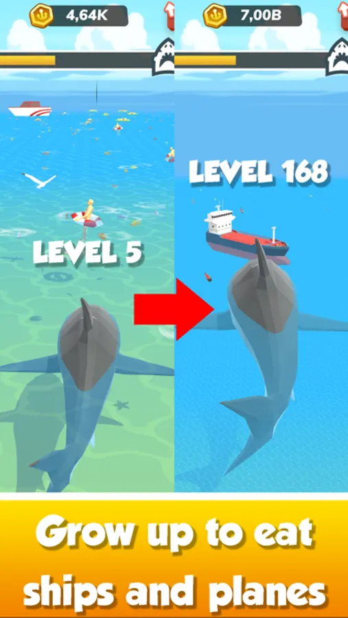 Your idle shark must evolve to increase its power in the ocean. Remember that you are not the only predator in the coastal waters! Just click and grow, hunt and eat. Each sea beast has unique bonuses to increase your profit and strength. Evolve your fish into a great white shark, Megalodon, or hammerhead shark! They have monstrous 3D jaws to bite! Upgrade your monster’s swimming speed, damage, and resistance levels.