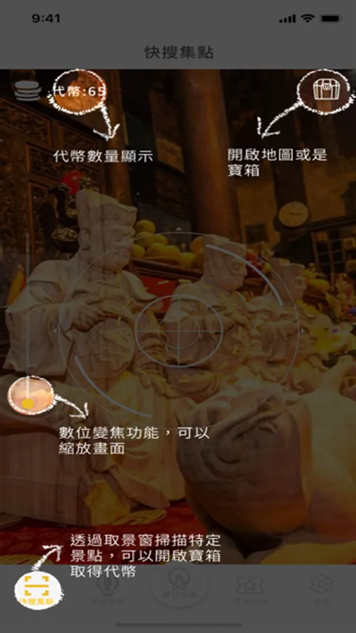 3. 到達現場位置後使用快搜功能,實現[蒐集金幣]動作,每天可以蒐集一次金幣。