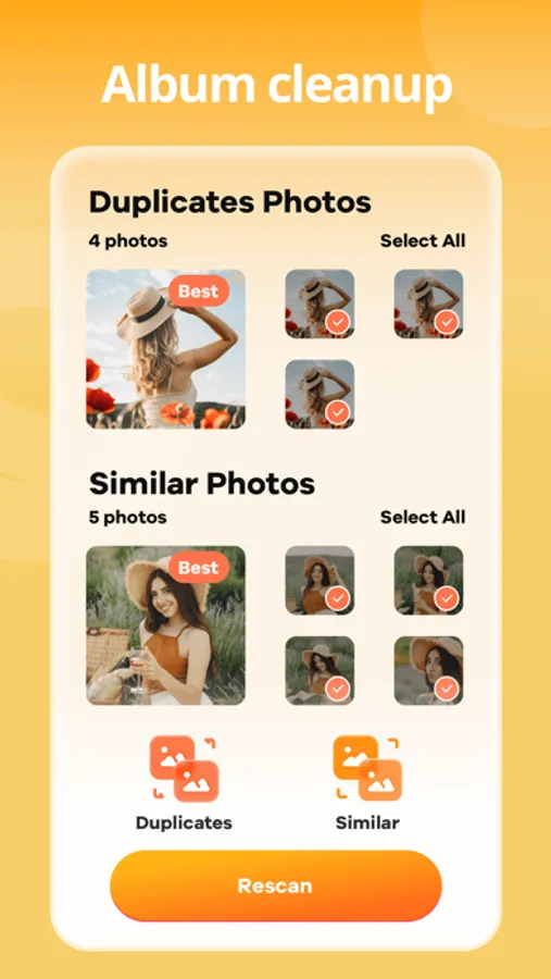 One-click to clean up duplicate photos, as well as useless videos and screenshots!