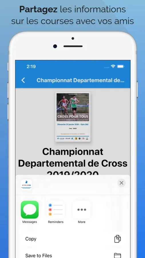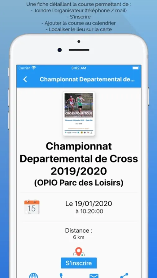 Possibilité de joindre les organisateurs directement depuis la fiche de la course (téléphone, mail), partager la course avec ses amis (SMS), ajouter la course au calendrier du téléphone, localiser le lieu de la course.