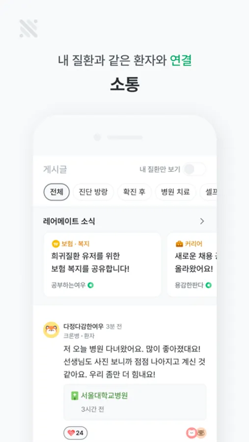 • 레어메이트 게시글을 통해 내 질환 관리에 도움을 받아보세요.