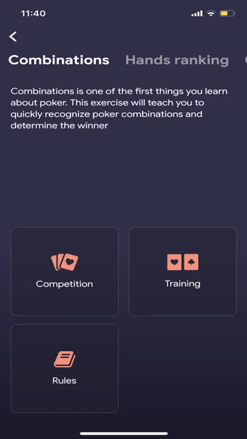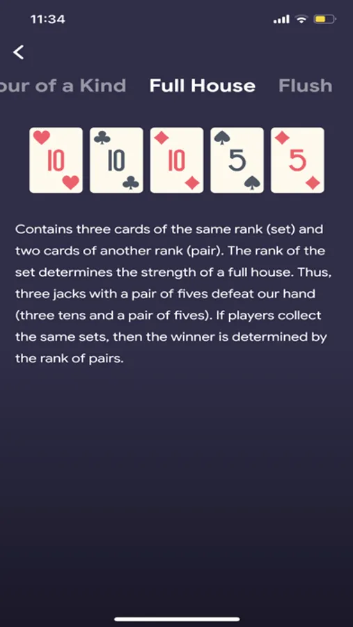 In our app you can find poker rules, the description of all combinations and stages of the game. Examples of typical situations will help you quickly learn game principles and start playing poker with your friends tonight.