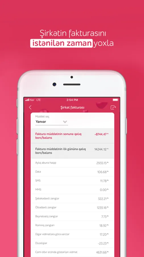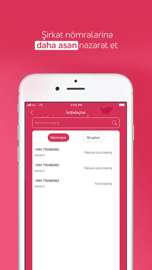 Nar+ biznes ilə şirkət nömrələrinin idarəsi daha asan oldu. Tətbiq vasitəsi ilə faktura borcunu, cari ay üçün istifadəni öyrənə və şirkət nömrələrini idarə edə bilərsən. Müxtəlif tarifləri və paketləri müqaisə edərək, şirkət nömrələri üçün ən uyğununu seçib aktiv edə, hər nömrənin kredit limitini tənzimləyə bilərsən. Tətbiq şirkət nömrələrinə pulsuz SMS göndərmək imkanı təqdim edir. İstənilən zaman həm şirkət həm də nömrələr üzrə faktura əldə edə bilərsən. Bu tətbiq vasitəsilə sən, edilən zənglər, internet istifadəsi və ümumi əməliyyat tarixçəsini öyrənə bilər və müxtəlif SİM-kart əməliyyatlarını yerinə yetirə bilərsən.