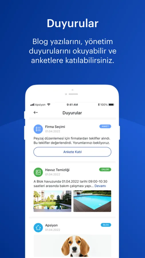 • Anket ve Fotoğraflar: Yönetiminizin sizlerle paylaştığı anketlere katılabilir, paylaşılan fotoğraflara yorum yazabilirsiniz.