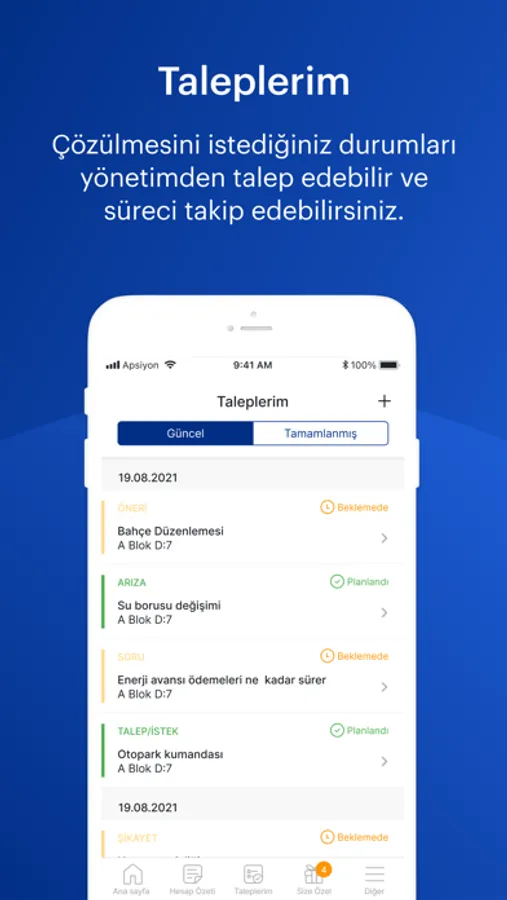 • İş Talebi ve Takibi: Örneğin, musluğunuz bozuldu. Bunun için iş talebi açıp ardından takibini de gerçekleştirebilirsiniz.