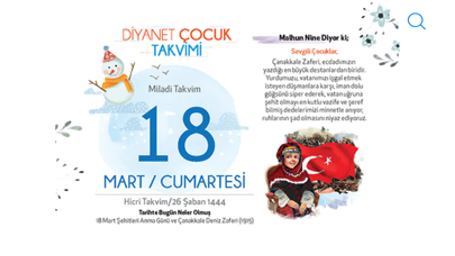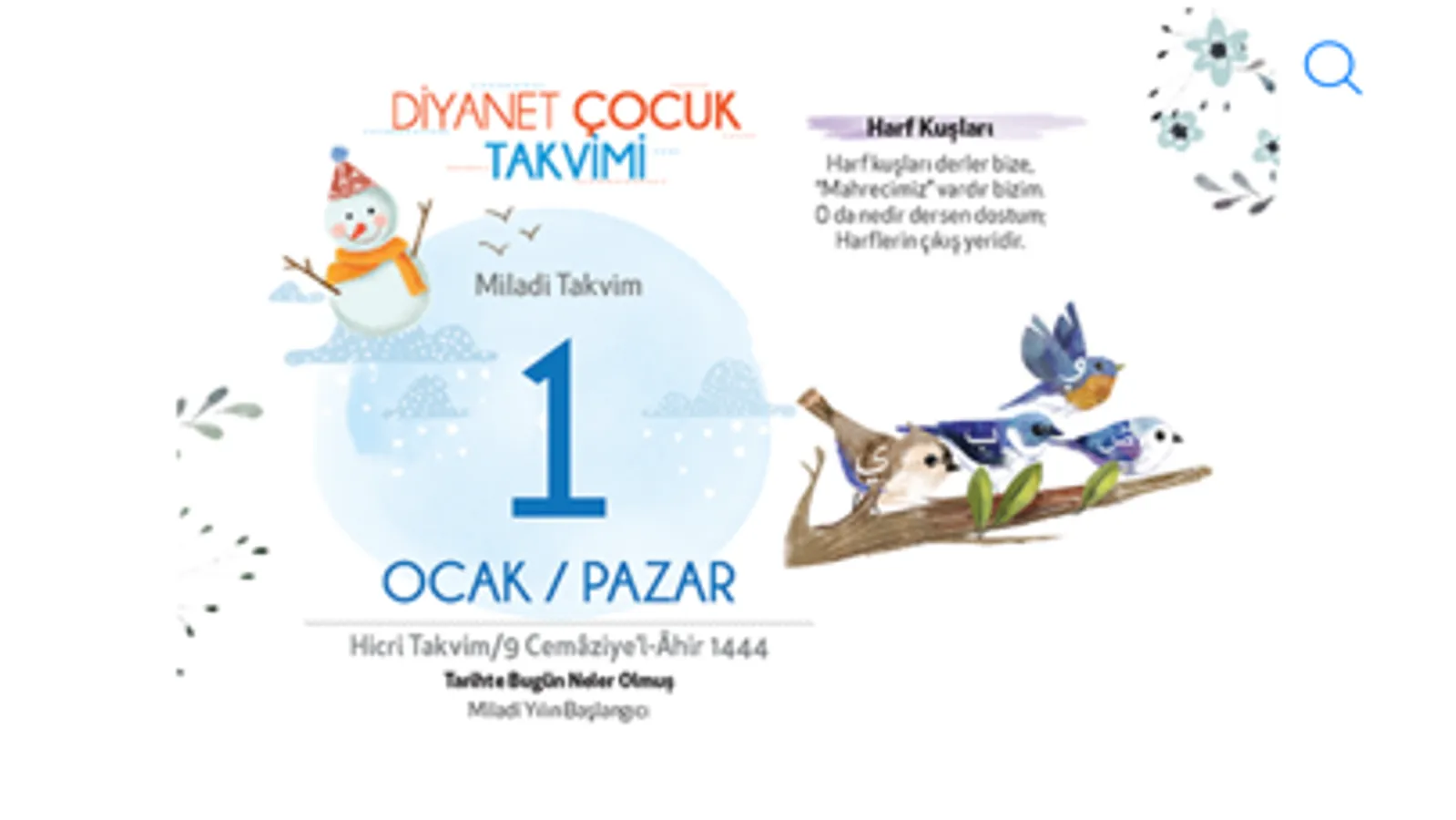 Başkanlığımız, çocuklarımıza manevi değerlerimizi öğretecek dini hikayeler, şiirler ve yazılarla dolu Diyanet Çocuk Takviminin mobil uygulamasını hizmete sundu. Yavrularımızın mobil cihazlarla her yerden takvime erişmesini sağlayacak uygulamamızda, günlük hikayeler, dini bilgiler içeren takvim alışkanlığı kazanacaklardır.