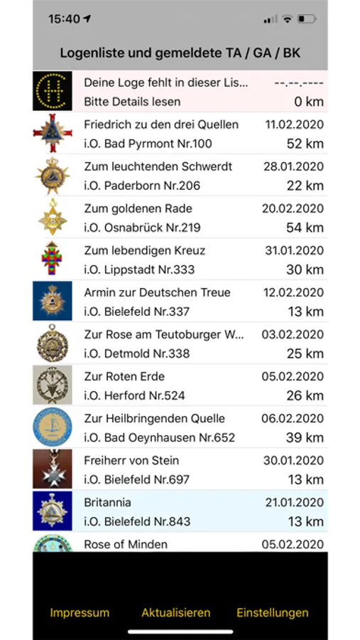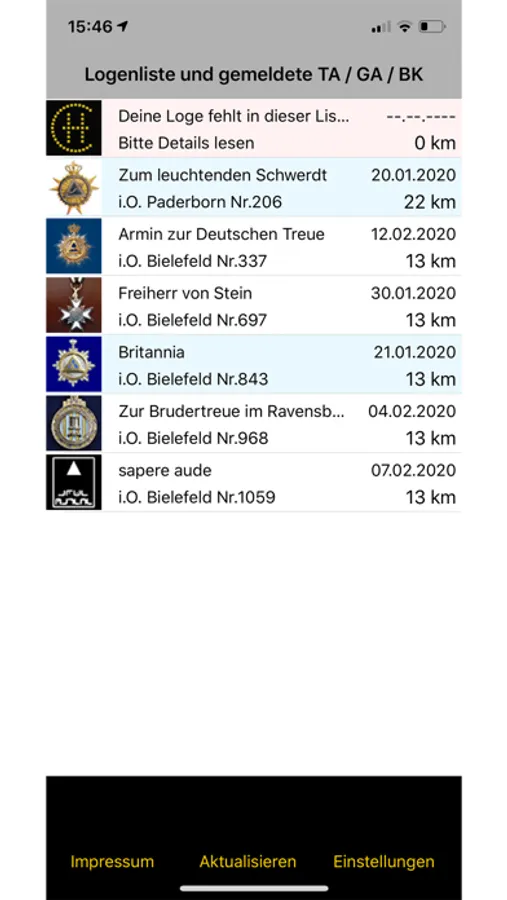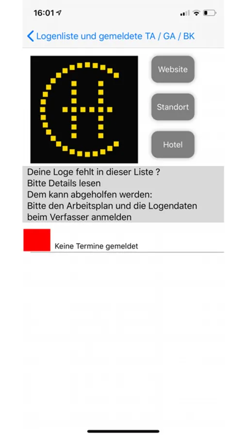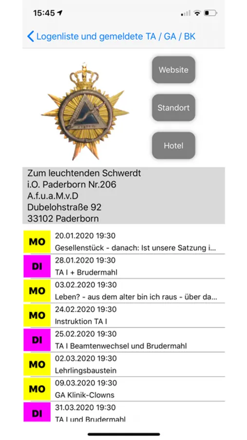 Auflistung in der Regel deutschsprachige Freimaurerlogen mit gemeldeten oder veröffentlichten Arbeitsplänen, Logenadresse, Entfernung, Navigationsmöglichkeit sowie Hotelauskunft, Gaststätten usw. über Apple Maps.