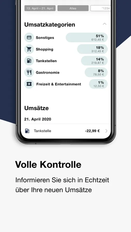 - Volle Kontrolle: Lassen Sie sich in Echtzeit über neue Umsätze informieren, blockieren Sie temporär Ihre Karte und geben Sie sie wieder frei oder sperren Sie diese im Verlustfall direkt über Ihr Smartphone.