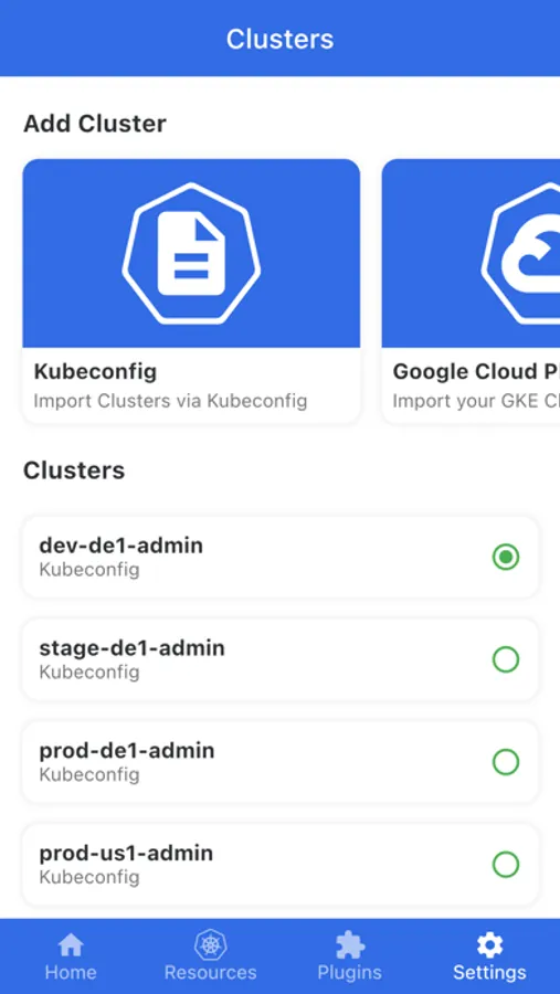 - Manage multiple Clusters: Add multiple clusters via `kubeconfig` or your preferred Cloud Provider, including Google, AWS and Azure.