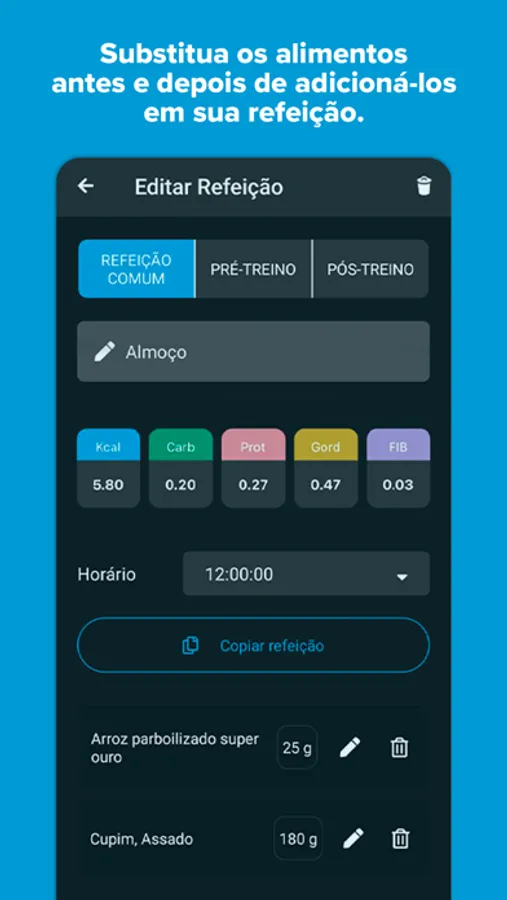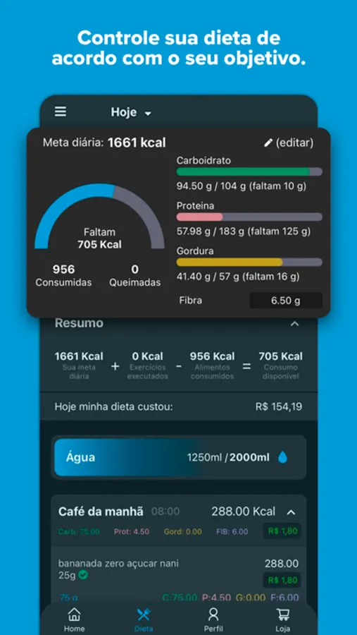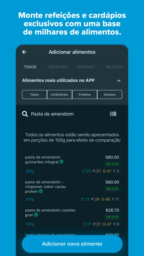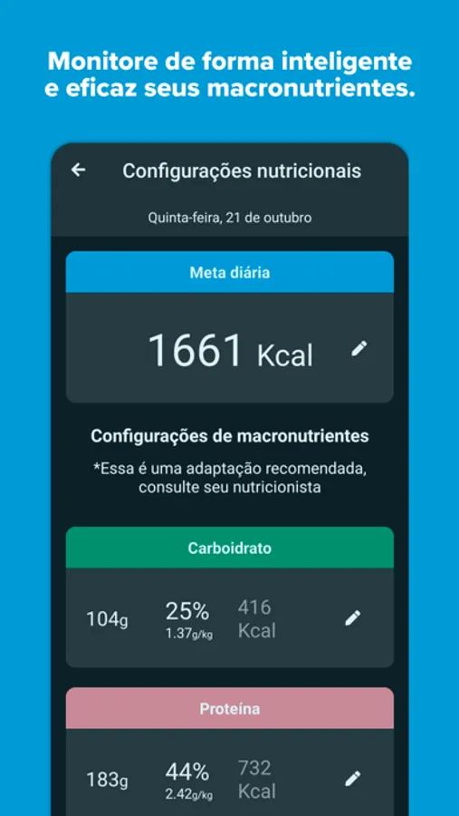 Monitore de forma inteligente e eficaz seus macronutrientes: carboidratos, proteínas e gorduras.