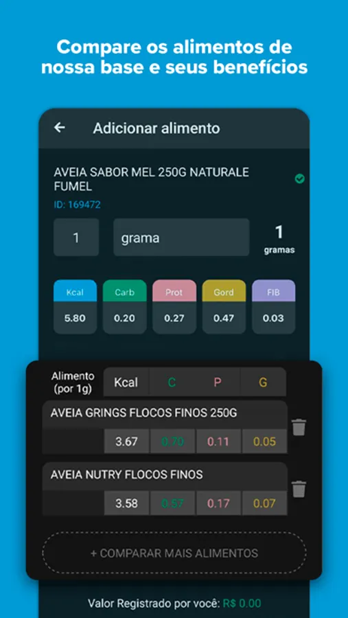 Para novos cadastros, o app irá exibir o nome e o usuário poderá completar as demais informações nutricionais. Estes alimentos cadastrados por usuários poderão ser vistos, consultados e editados (caso necessário) por outros usuários do App.